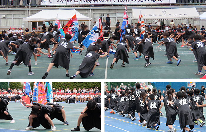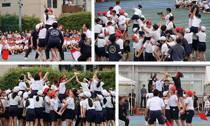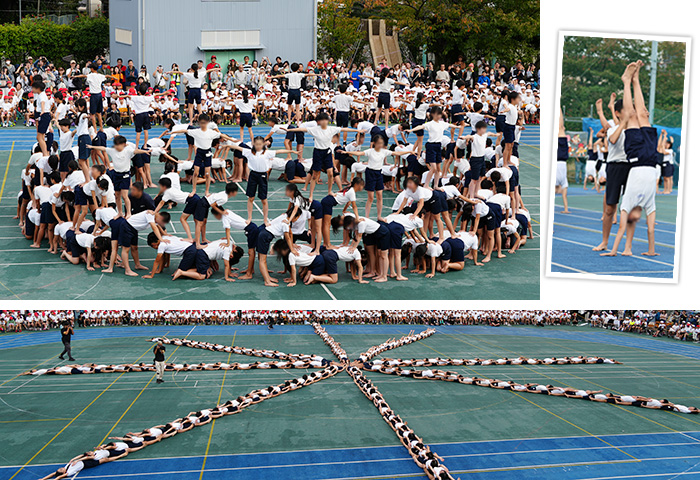 全員で声を掛け合い全力で取り組んだ組体操。迫力満点でした!個人技もバッチリ!全員が一致団結して、まさに6年間の「絆」を感じる演技でした。