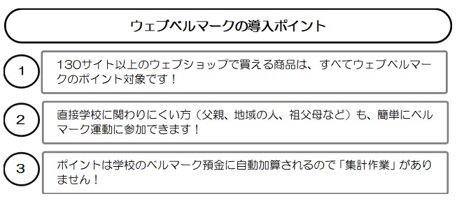 これまでのベルマーク活動と並行して、ネットのお買い物で手軽にできる「ウェブベルマーク」の活用にもご協力をいただけないでしょうか?